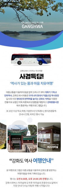 이번 여행은 대중교통 등을 이용해 강화도에 개별적으로 도착하는 여행객들이 몽골 침략 고려 시기부터 개화기 기독교 전파 역사, 강화도에서 태동한 우리나라 현대식 직물 산업 역사까지 돌아보는 현장 답사를 진행한다. 또 코로나19로 지친 국민의 면역력을 강화하는 강화도 약쑥을 이용한 전통 치유 요법 좌훈욕, 온열 뜸 체험(100분 포함), 새롭게 단장한 강화풍물시장에서 강화도 특식 밴댕이 회덮밥 등을 자유롭게 즐길 수 있는 여행 프로그램이다.
