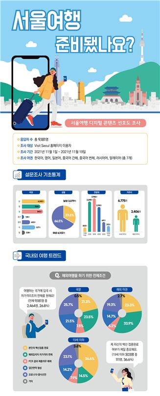 서울관광재단(대표이사 길기연)은 2021년 11월 1일부터 11월 19일까지 서울관광 공식 웹사이트 visitseoul.net을 통해 7개 언어권 총 9,181명의 응답자를 대상으로 ‘서울여행 디지털 콘텐츠 선호도 조사’를 진행했다.