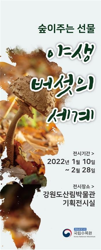 강원도산림과학연구원(원장 엄창용)에서 운영하고 있는 강원도산림박물관 (춘천시 화목원길 24)에서는 1월 11일 ~ 2월 28일까지‘숲이 주는 선물 – 야생버섯의 세계’를 주제로 산림생태계에서 중요한 역할을 수행중인 다양한 버섯의 종류들에 대해 야생버섯 기획전시회를 개최한다.