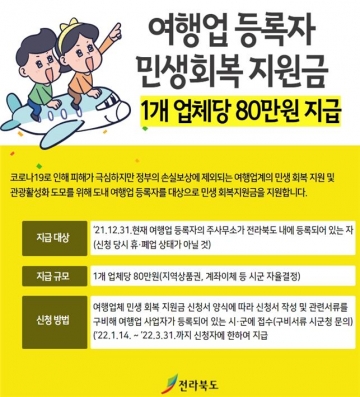 전라북도가 코로나19 장기화로 어려움을 겪는 여행업계에 힘을 싣어 주고자 민생회복 지원금을 지급한다.