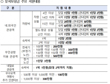 시는 기존 당일 관광위주로 지원됐던 국내외 유치지원 시스템을 개선해 숙박비 지원액을 1박의 경우 1인당 3만원(4인 이상 14인 이하 차량) 또는 60만원(15인 이상 차량)으로 당일 여행 대비 지원액을 기존 2배에서 3배로 확대한다.