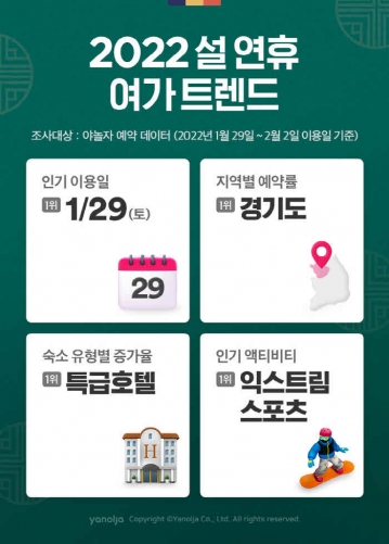 글로벌 여가 플랫폼 기업 야놀자(총괄대표 이수진)가 ‘2022 설 연휴 여가 트렌드’를 발표했다.