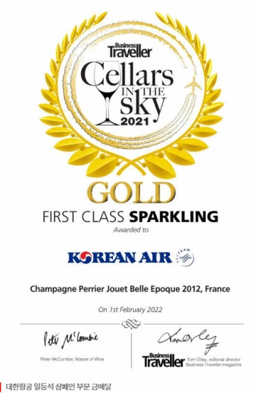 대한항공은 2월 24일 오후(현지시간) 런던에서 세계 최고 권위의 항공사 와인 경연 대회인 ‘셀러스 인 더 스카이 2021′(Cellars in the Sky Award 2021)에서 퍼스트 클래스 샴페인 부문과 디저트 와인 부문에서 각각 1위에 선정되며 금메달을 수상했다.