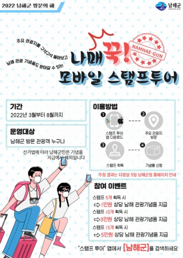 남해군은 지난 2022 남해군 방문의 해를 맞이해 모바일 앱을 활용한 비대면 관광 프로그램 ‘나매 꾹! 모바일 스탬프투어’를 8월 말까지 운영한다고 밝혔다.