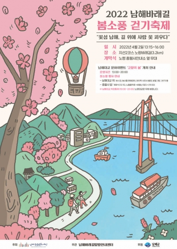 ‘남해대교 문화 이벤트’와 함께 열리는 ‘2022 남해바래길 봄소풍 걷기 축제’는 ‘꽃섬 남해, 길 위에 사람 꽃 피우다!’ 라는 주제로 개최된다.