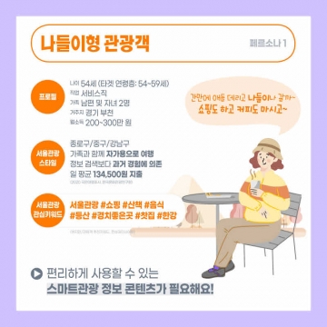- 나들이형 관광객은 휴일을 활용해 가족과 함께 서울로 나들이를 오는 유형이다. 경기도에 거주하는 50대 중후반 여성으로, 서비스직에 종사하며 월 소득은 200~300만 원 수준이다. 자가용으로 종로구, 중구, 강남구 등을 주로 방문하며, 정보를 미리 검색하기보다 과거의 경험을 기반으로 계획을 세우는 경향이 있다. 일 평균 134,500원의 금액을 지출하고, 휴식에 대한 동기가 높아 서울관광 시 #쇼핑 #음식 #한강 #공원 #산책 등의 키워드에 관심을 가진다. (관련 사진 1)