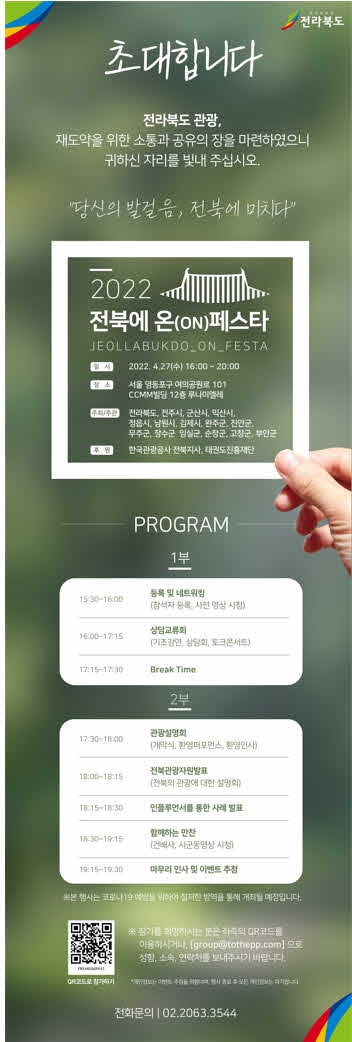 전라북도는 14개 시군과 함께 4월 27일(수) 서울 여의도에서 여행업계와 홍보관계자 등 250여 명을 대상으로 ‘2022 전북에 온(ON) 페스타(Festa)’를 개최했다고 밝혔다.