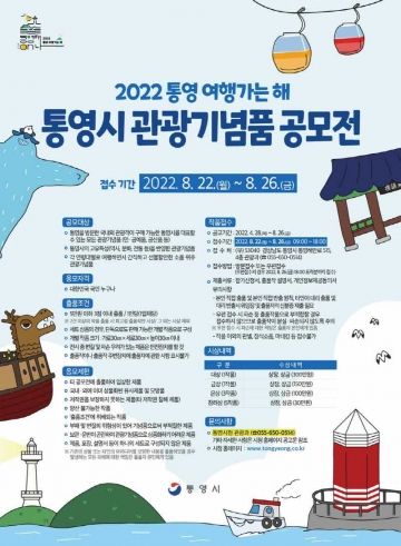 통영시에서는 통영을 대표하는 특색 있고 차별화된 우수 관광기념품을 발굴·육성하고자「2022 통영 여행가는 해」를 맞아 통영시 관광기념품 공모전을 개최한다고 밝혔다.