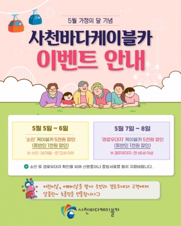 사천시시설관리공단(박태정 이사장)은 2022년 5월 가정의 달을 맞아 사천바다케이블카에서 온 가족이 함께 즐길 수 있는 다양한 할인 및 기념품 증정 이벤트를 선보인다.