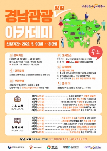 경남도는 경남관광재단과 함께 경남관광기업지원센터에서 주최하는 ‘관광 창업 아카데미’ 교육생을 5월 9일부터 5월 31일까지 총 100명 모집한다고 밝혔다.
