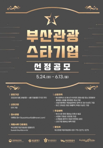 부산관광공사(사장 이정실, 이하 공사)는 부산광역시(이하 부산시)와 문화체육관광부 ‧ 한국관광공사의 지원을 받아 부산 관광을 선도할 ‘2022 부산 관광 스타기업’선정 공모를 진행한다고 24일 밝혔다.