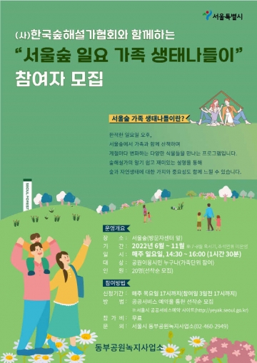 참여를 원한다면 매주 목요일(참여일 기준 3일전) 17시까지, 서울시 공공서비스 예약 사이트(https://yeyak.seoul.go.kr/)를 통해 신청 할 수 있다. 추가 문의사항은 서울시 동부공원녹지사업소 공원여가과 (02-460-2949)로 하면 된다.