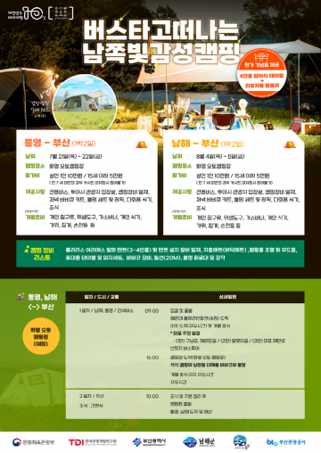 통영에서 떠나는 부산 일정은 첫날 ▲해운대 블루라인파크 ▲미포일대 자유여행 ▲부산 브릿지 버스투어 ▲화명오토캠핑장에서 바비큐와 불멍이 포함된 감성캠핑을 즐기고, 다음 날 조식 후 다시 통영으로 돌아오는 일정이다.