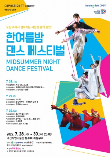 한여름밤 댄스 페스티벌은 온 가족이 즐길 수 있는 무료공연으로 무더운 여름밤을 식혀줄 다양하고 흥겨운 춤을 통해 시민에게 휴가 같은 시간을 선사할 것이다.