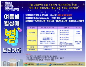 거창군은 오는 29일부터 8월 4일까지 거창월성우주창의과학관에서 ‘여름밤 월성에 별 보러 가자’를 주제로 ‘2022년 월성여름과학체험한마당’을 운영한다.
