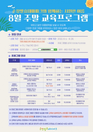 (재)순창발효테마파크관리운영재단(원장 김재건)이 오는 8월 주말 동안 여름맞이 체험프로그램을 운영한다고 밝혔다.