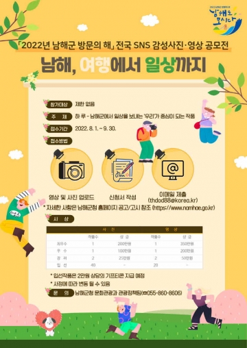 남해군은 ‘2022 남해군 방문의 해’를 맞아 전국 규모의 ‘SNS 감성 사진·영상 공모전’을 개최한다고 밝혔다.