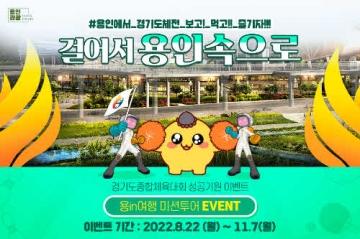 용인특례시가 2022 경기도종합체육대회 성공 개최를 기원하기 위해 대회 관람은 물론 관내 관광명소를 탐방하는 ‘걸어서 용인속으로’ 미션투어 이벤트를 진행한다고 23일 밝혔다.
