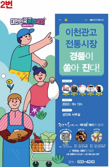 행사기간 내 관고전통시장 이용 고객에 경품 이벤트를 진행하며, 오는 9월 13일 추첨을 통해 1등(1명) 55인치TV, 2등(2명) 전기밥솥, 3등(3명) 로봇청소기, 4등(5명) 에어프라이어, 5등(20명) 후라이팬을 증정한다.