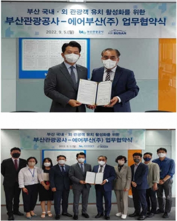 부산관광공사와 에어부산은 5일 부산지역 관광 활성화와 관광산업 발전을 위한 업무협약을 체결했다고 밝혔다.
