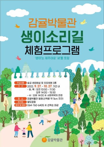 서귀포시(시장 이종우)는 오는 9월 27일부터 10월 27일까지 올해 5월부터 시작한 2022 웰니스 체험 프로그램 「감귤의 모든 것」의 가을편 ‘감귤박물관 생이소리길 프로그램’을 감귤박물관에서 운영한다.