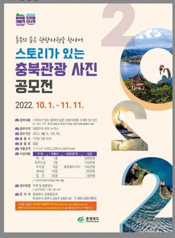 공모기간은 10월 1일부터 11월 11일까지이며, 그동안 잘 알려지지 않은 충북의 우수한 자연경관과 역사·문화적 가치가 높은 관광자원을 소재로 2021년 1월 이후 촬영한 사진을 스토리와 함께 응모하면 된다.