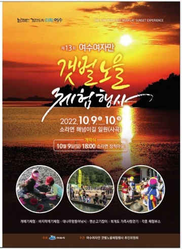 ‘제13회 여수여자만 갯벌노을 체험행사’가 10월 9일부터 10일까지 이틀간 여수시 소라면 해넘이길 일원에서 개최된다.