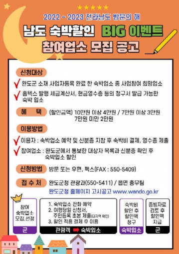 완도군(군수 신우철)에서는 ‘2022~2023 전라남도 방문의 해’를 맞아 「남도 숙박 할인 빅 이벤트 지원 사업」에 참여할 숙박업소를 10월 14일까지 모집한다.