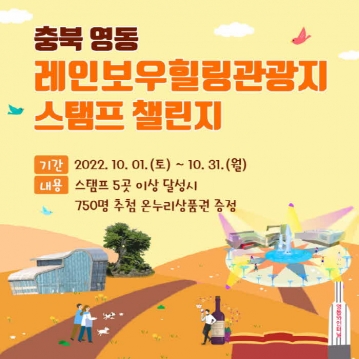 충북 영동군은 천고마비의 계절인 가을을 맞이하여 10월 한 달간 영동 레인보우 힐링관광지를 홍보하고 걷기운동 활성화를 위하여 관광지 스탬프 챌린지를 운영한다고 밝혔다.