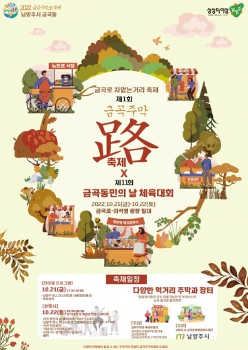 남양주시(시장 주광덕)는 오는 21일과 22일 이틀간 금곡동 금곡로 및 이석영광장 일원에서 ‘제1회 금곡주막路 축제’를 개최한다. 22일에는 금곡동 체육회가 주관하는 ‘제11회 금곡동민의 날 체육 대회’도 함께 열릴 예정이다.