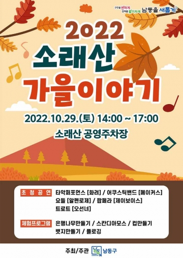 인천시 남동구는 오는 29일 소래산 공영주차장에서 ‘2022 소래산 가을 이야기’ 축제를 개최한다고 27일 밝혔다.
