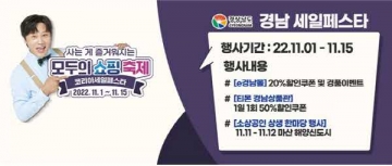 경상남도는 대한민국 쇼핑주간인 ‘2022 코리아세일페스타’와 연계하여 11월 1일부터 15일까지 다양한 할인행사 및 이벤트를 추진한다.