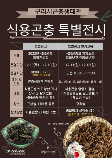 구리시(시장 백경현)는 오는 12월 10일부터 18일까지 곤충생태관 표본실에서 ‘2022년 구리시 곤충생태관 식용 곤충 특별전시’를 개최한다.