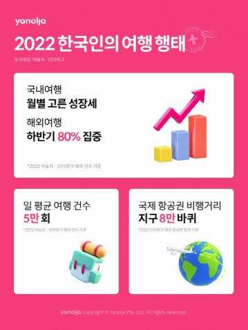 지난해에는 팬데믹과 엔데믹을 거치며 여행업계에도 많은 변화가 있었던 만큼, 야놀자는 국내 1위 플랫폼으로서 2022년 한국인들의 국내(야놀자)ㆍ해외(인터파크) 여행 데이터를 분석했다. 먼저, 국내여행은 월별 고른 성장세를 보여 성수기와 비성수기의 구분이 다소 완화된 것으로 나타났다. 반면, 해외여행 예약은 각국의 출입국 규제가 완화되기 시작한 하반기에만 80% 이상 몰렸다.