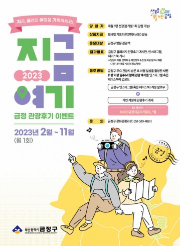 금정구(구청장 김재윤)는 지난해에 이어‘지금, 금정의 여행을 기록하세요! 지.금.여.기 금정 관광후기 이벤트’를 2023년 2월부터 11월까지 매월 진행한다.