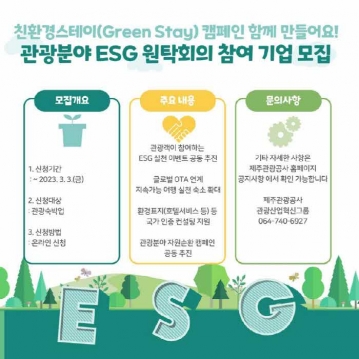 제주특별자치도와 제주관광공사(사장 고은숙)은 관광분야 자원순환을 선도하기 위해 관광분야 ESG 원탁회의 참여 기업을 2월 20일부터 오는 3월 3일까지 모집하고 있다고 밝혔다.