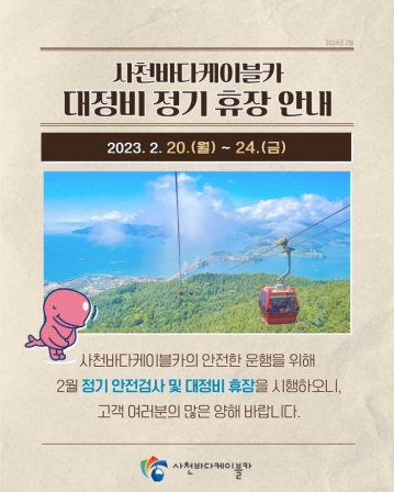 사천시시설관리공단(이사장 박태정)은 사천바다케이블카 2023년 상반기 대정비 및 정기 안전검사를 위해 오는 20일부터 24일까지 5일간 휴장한다.