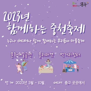 대전 중구(구청장 김광신)는 3월 1일부터 중구 어디서 누구나 함께하는 ‘2023년 함께하는 중천(中川)축제’를 개최한다고 밝혔다.