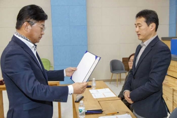 [사진 설명 : 최충규 대덕구청장(사진 왼쪽)이 27일 대덕구 관광진흥위원회 출범식에 참석해 이준재 한남대 호텔항공경영학과 교수에게 위촉장을 전달하고 있다.