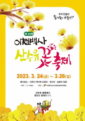 코로나19로 3년간 중단되었던 이천백사산수유꽃축제가 올해로 24번째 생일을 맞이하며 3.24(금)~3.26(일) 3일간 개최된다. 올해에는 산수유꽃이 예년에 비해 조금 일찍 꽃망울을 터뜨려 이를 예측한 이천시와 추진위원회에서는 지난해 만개시점을 기준으로 축제기간을 한주 앞당겨 3.24.(금)~3.26.(일) 3일간 개최한다고 밝혔다.