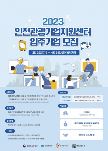 인천광역시(시장 유정복)와 인천관광공사(사장 백현)는 인천관광기업지원센터 입주기업을 3월 29일부터 4월 24일까지 공개 모집한다고 밝혔다.
