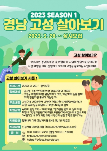 신청 자격은 경남지역 외 거주자로 만 19세 이상이면 신청할 수 있다. 고성군 여행에 대한 활동 의지가 크고, 유튜브, 블로그 등 본인 SNS로 홍보가 가능한 사람이어야 한다.