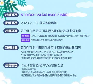 이 사업은 신체‧경제적 여건으로 인해 관광활동이 어려운 취약계층의 관광복지 실현을 위해 저소득층에게는 1인당 15만 원, 거동이 불편한 장애인의 경우 동반자 1인을 포함해 30만 원 상당의 여행활동비를 지원하는 사업이다.