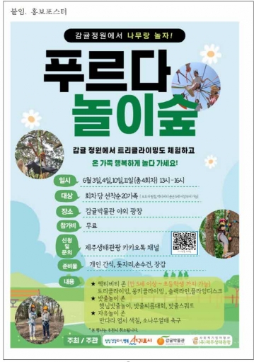 서귀포시(시장 이종우)는 건강한 서귀포시, 행복한 시민 구현을 위한 「건강도시 만들기」를 위하여 감귤박물관 팝업 에코 놀이터를 6월 3일, 4일, 10일, 11일간 총 4회차로 감귤박물관 야외공연장 일원에서 운영한다.