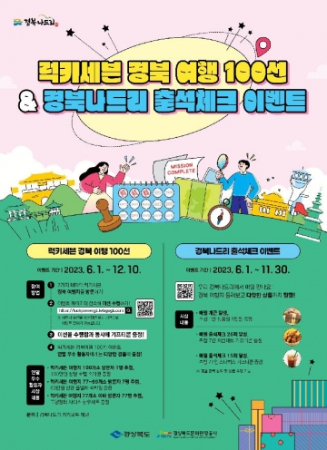 경북도와 경상북도문화관광공사는 6월 1일부터 12월 10일까지 경북나드리 홈페이지에서 도내 관광 명소 및 축제 100선을 지정해 ‘럭키세븐 경북여행 100선&경북나드리 출석체크’행사를 실시한다.