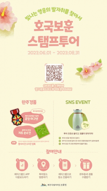 제주특별자치도 보훈청(청장 양홍준)은 도민, 관광객, 초중고생 누구나 참여할 수 있는 ‘호국보훈 스탬프 투어’ 프로그램을 6월 1일~8월 31일 3개월간 운영한다.