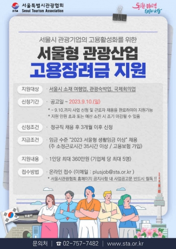 한편 서울시에서는 이번 사업을 통한 고용장려금 지급과 더불어 (사)서울관광협회와 협력하여 서울관광업 고용지원센터를 운영하고, 구인업체별 특성과 구직자 요구에 맞는 맞춤형 채용을 지원하는 등 관광업계 심각한 인력난 유출 문제 해소를 위해 다양한 지원책을 진행할 예정이다.
