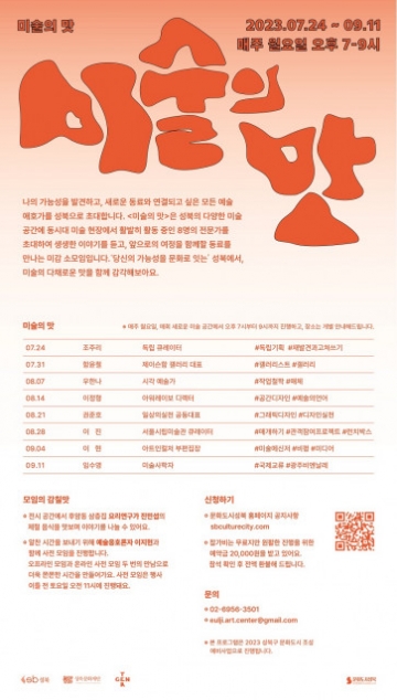 7월 24일(월)부터 9월 11일(월)까지 매주 월요일, 총 8회차에 걸쳐 진행되는 ‘미술의 맛’은 다양한 미술 현장에서 활발히 활동하는 전문가의 이야기를 듣고 연사와 참여자 간 상호 교류할 수 있는 프로그램이다. 시각예술공간이 다수 위치해 있고, 예술가들이 많이 거주하고 있어 다채로운 ‘미술의 맛’을 느끼기에 최적화된 성북의 지역적 특성이 프로그램에 그대로 녹아있다.