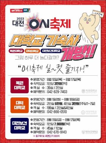 대전시는 오는 8월 11일부터 열리는 ‘대전 0시 축제’ 방문객 편의를 위해, 3개 대학교 기숙사 283객실을 여행 숙소로 개방한다