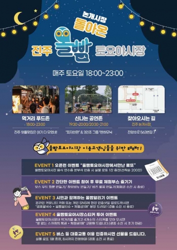 진주시와 진주시상권활성화재단은 코로나19 장기화로 위축된 전통시장을 활성화하고, 야간 및 체류형 관광객 유치를 위하여 지난해부터 올해 봄까지 열렸던 진주 논개시장 ‘올빰야시장’을 7월 한 달 재준비 기간을 거쳐 12일부터 다시 개장한다.